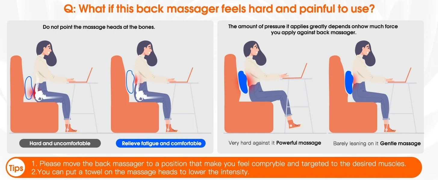 1.Relieve Muscle Soreness & Tension: The neck back massager is ergonomically designed to merge with the contours of different body parts. The neck massager's 4 Powerful 3D Massage Nodes automatically change direction every minute and can relax neck pain, back pain, foot pain, shoulder pain, leg pain even your full body pain and tight muscles.