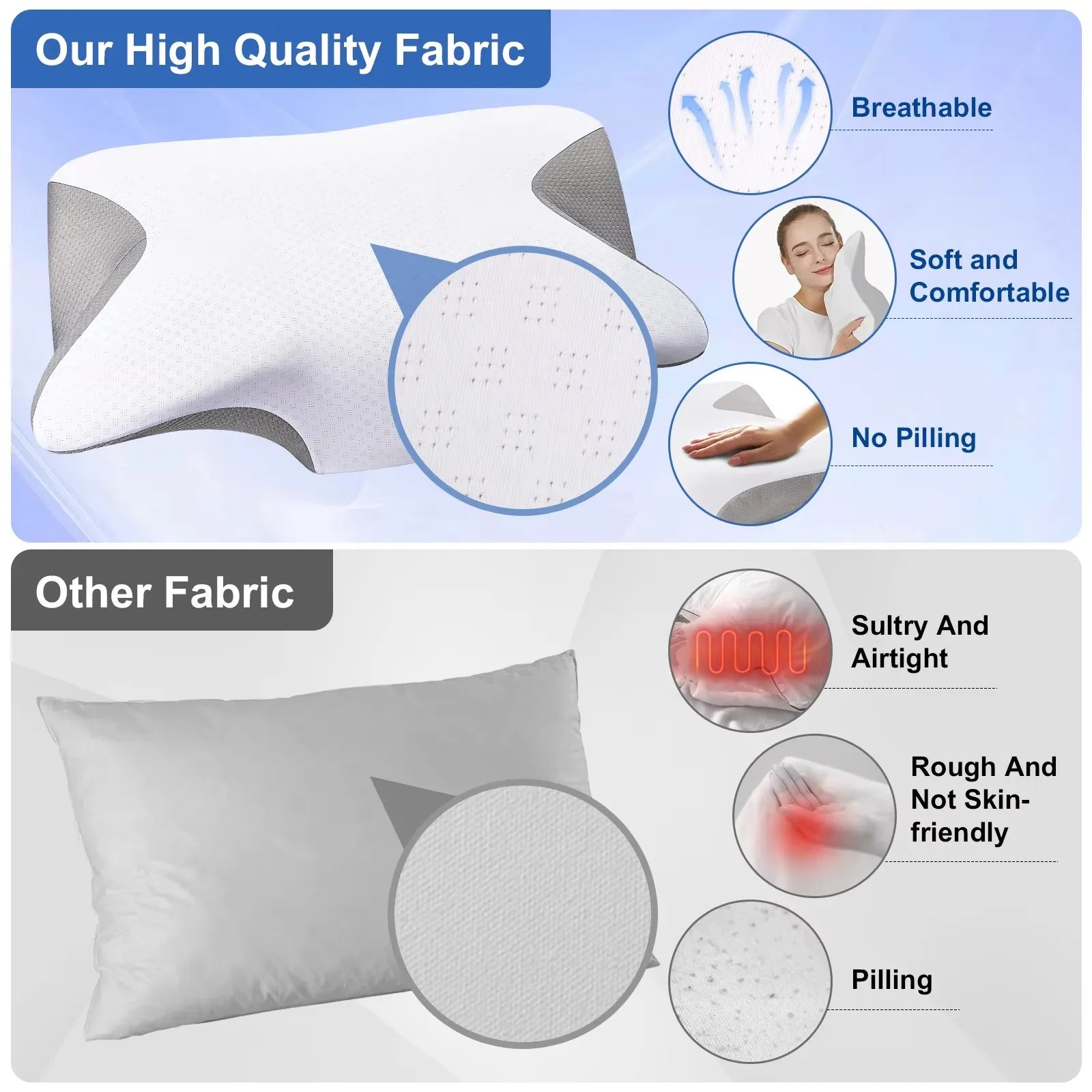 [2 Heights - Designed for Different Sleepers]Our pillow has 2 different contour heights on either side, so you can choose whichever works better for your sleep posture. Butterfly design shape gives armrests, no more arms numbness. It offers enough room for your shoulders and makes good nasal airflow for back, side & stomach sleepers. The hole inside was designed to cradle your head for optimal support & reduce the pressure of the skull. It allows for a comfortable yet supportive night's sleep.